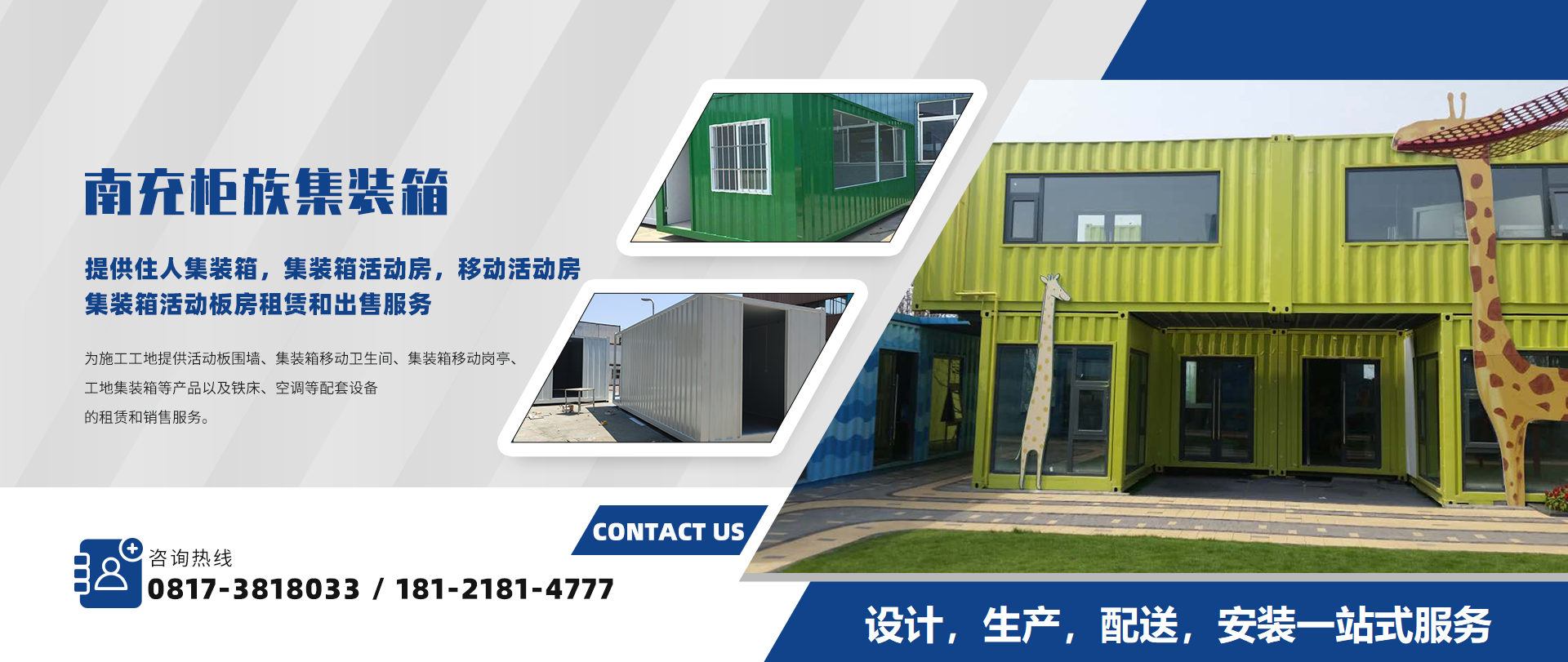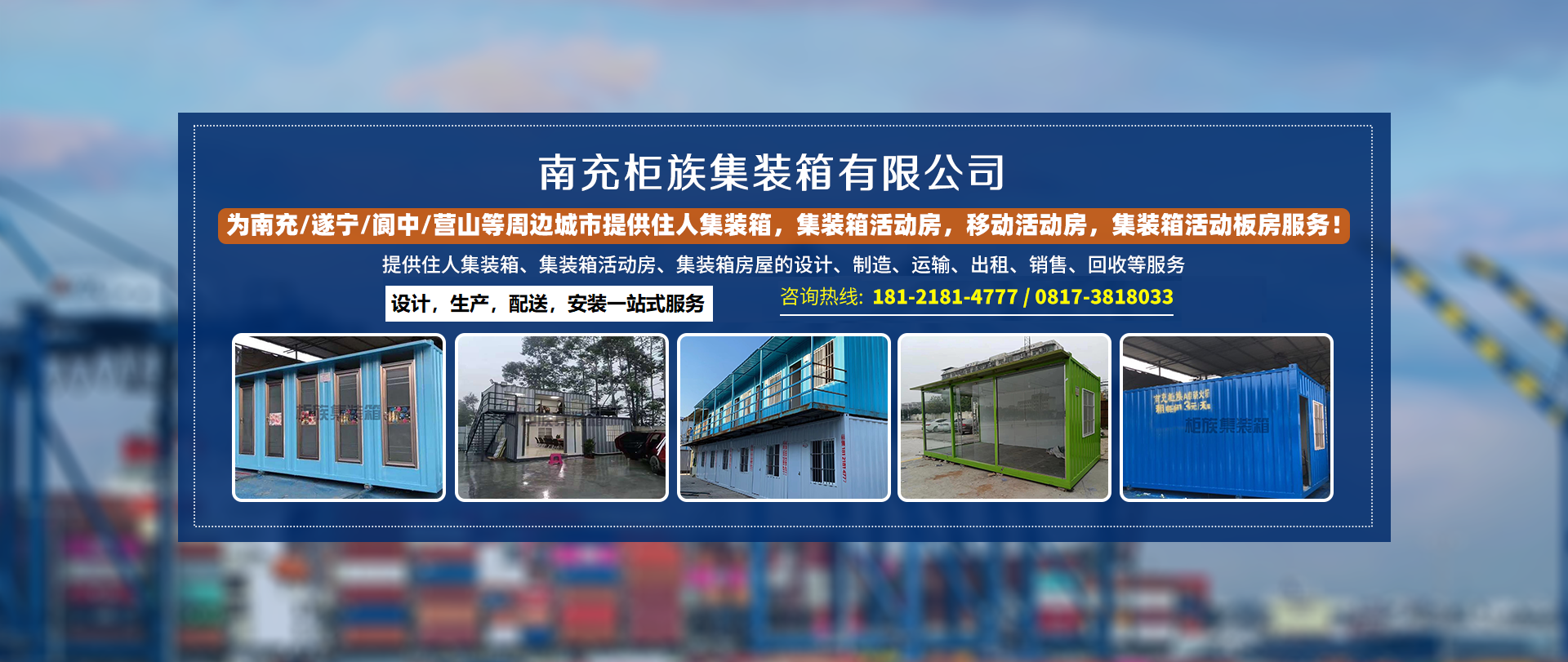 南充柜族集裝箱有限公司是一家為南充/遂寧/閬中/營山/蓬安/南部/西充等周邊城市提供住人集裝箱,集裝箱活動(dòng)房,移動(dòng)活動(dòng)房,集裝箱活動(dòng)板房服務(wù)!本公司專業(yè)服務(wù)南充住人集裝箱、南充移動(dòng)活動(dòng)房、南...